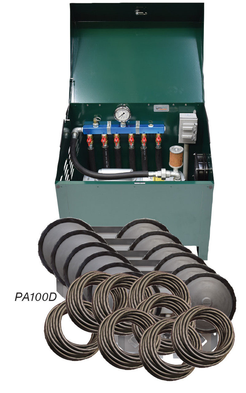 Complete Sentinel Deluxe Aeration System for ponds up to six acres depending on shape and depth of pond. 1 hp Rotary Vane RV100 compressor, 13.5 cfm, 14 amps, aerates up to 18′ deep. PA100D kit includes compressor, six valve outlet assembly, pressure gauge and pressure relief valve all mounted in SC22 lockable steel cabinet with cooling fan and electrical outlet installed. Now also with 6′ power cord pre-wired to plug cabinet system into GFCI protected outlet. Kit also includes six QS2 Quick Sink air diffusers, 800′ of 1/2″ Quick Sink tubing and fittings for connections.