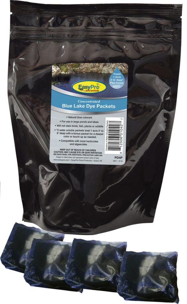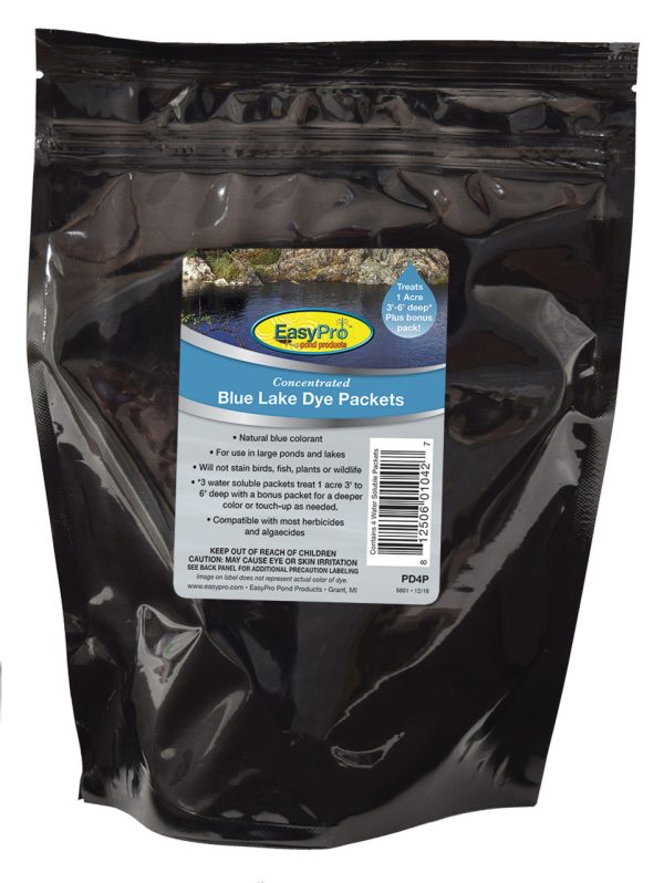 The use of Blue Lake Dye Packets are safe for fish and part of an overall pond maintenance program for backyard ponds. EasyPro Blue Lake Dye will improve the appearance of pond water and help with overall water quality. Water-soluble packets can simply be tossed into the pond for easy application.